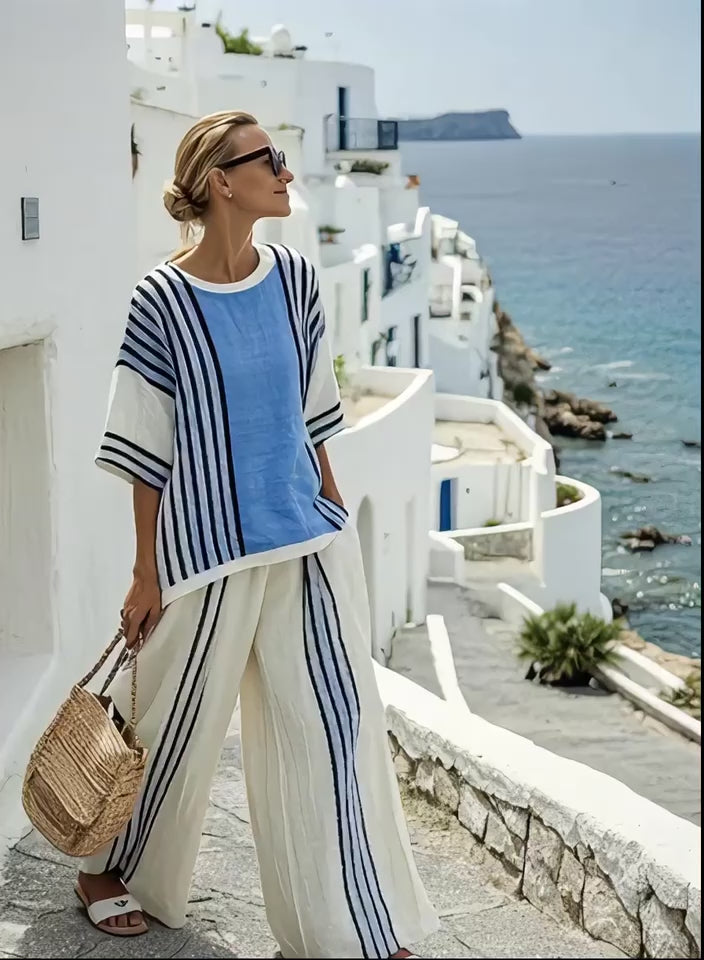 Ten zestaw dwóch części łączy modny wzór pasków z komfortem użytkowania. Top z długim rękawem oraz spodnie o luźnym kroju sprawdzą się podczas ciepłych dni, zapewniając swobodę ruchów i elegancki wygląd.