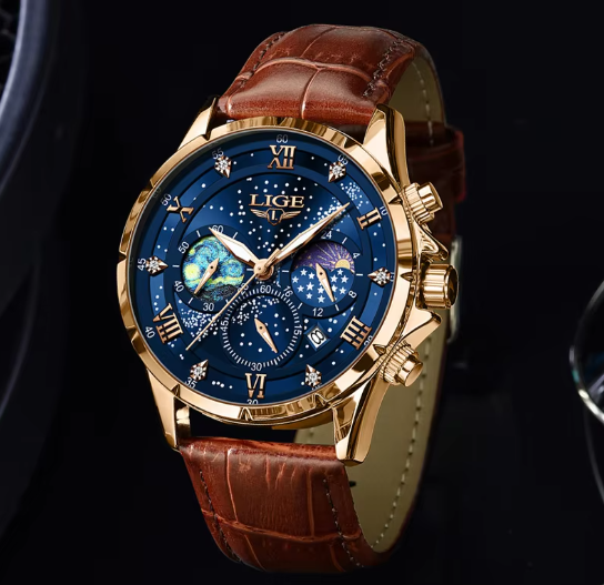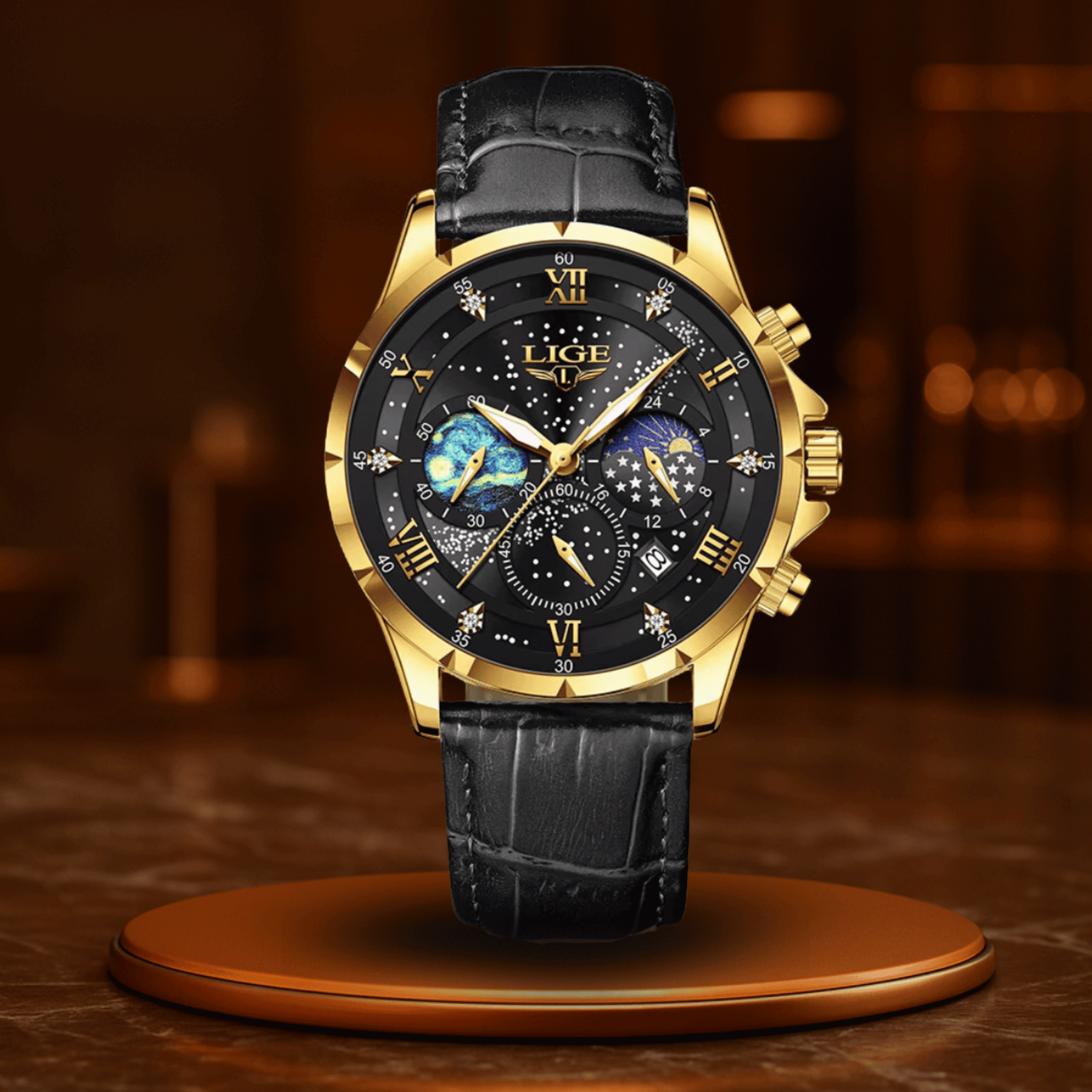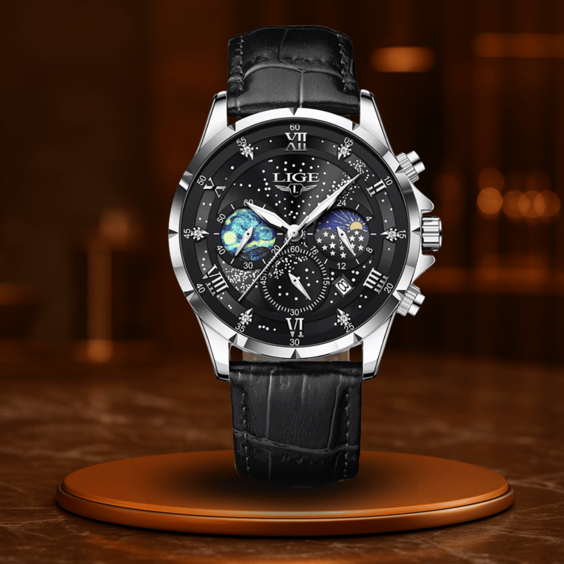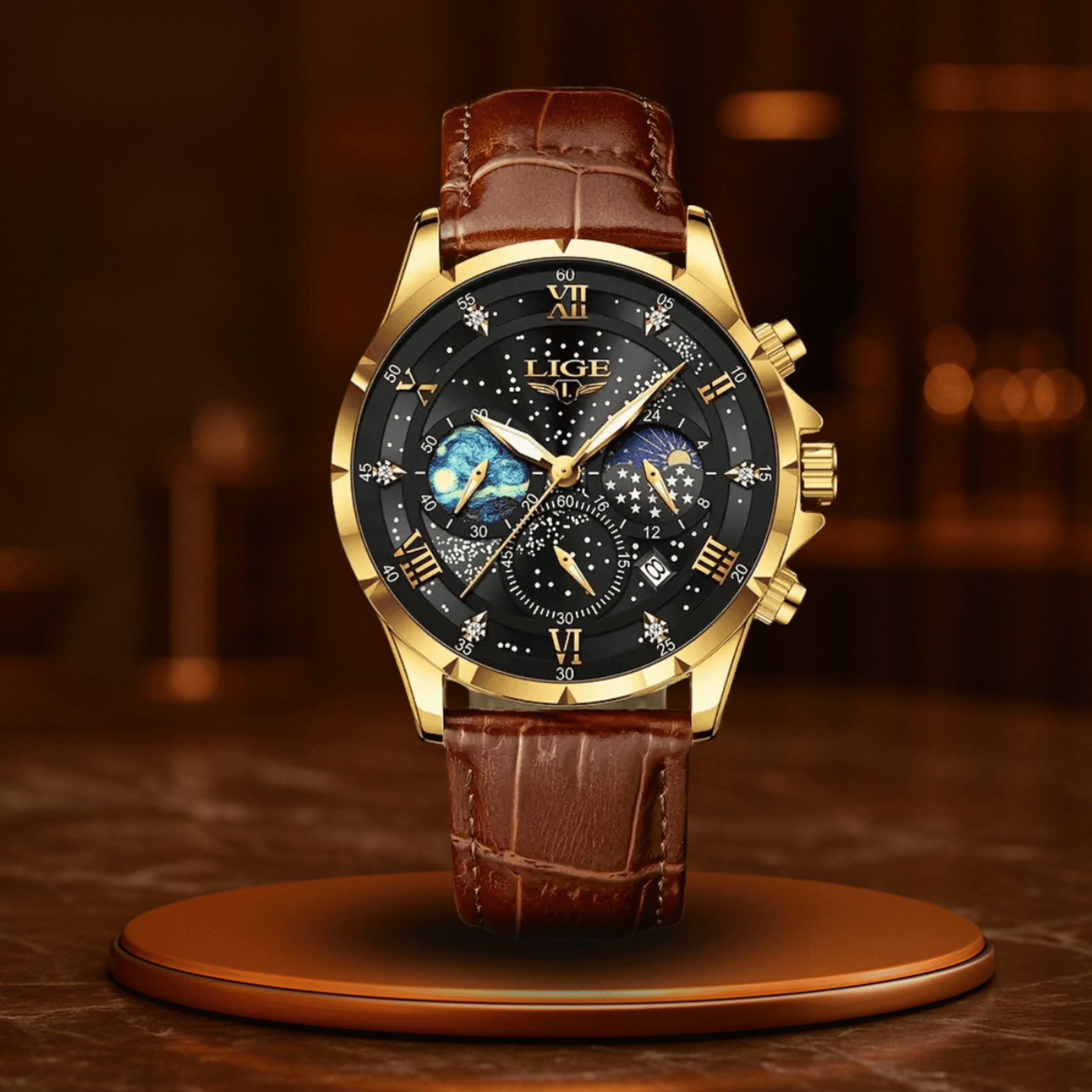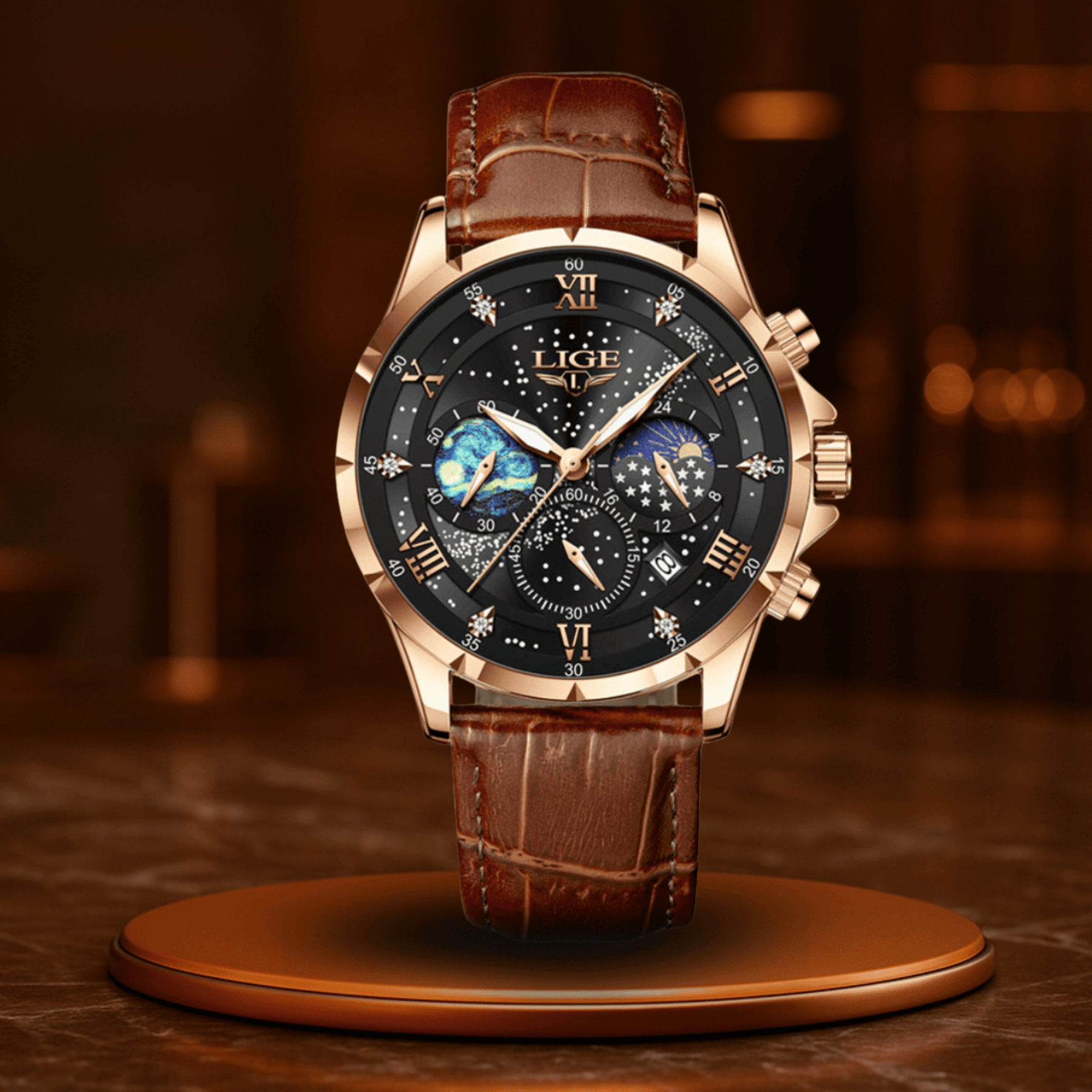 Lunova 42 to idealny czasomierz dla mężczyzn, którzy zwracają uwagę nie tylko na spotkania, ale także na momenty. Klasyczny design z cienkim skórzanym paskiem łączy precyzyjny mechanizm kwarcowy z fascynującym wyświetlaczem fazy księżyca – cichy ukłon w stronę tych, którzy myślą w większych cyklach.