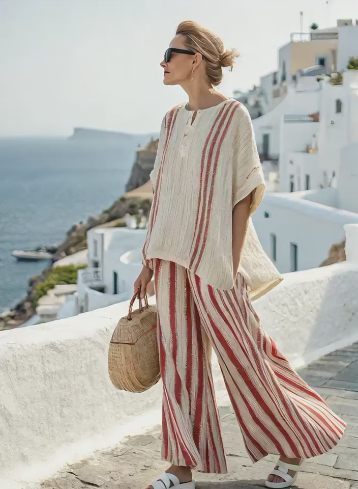 Ten komplet w stylu boho to połączenie modnego wzoru pasków. Top z długim rękawem i luźne spodnie zapewniają nie tylko styl, ale także komfort w gorące dni. Idealny na spacery, wakacje i codzienne wyjścia.